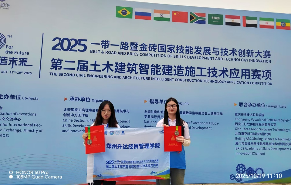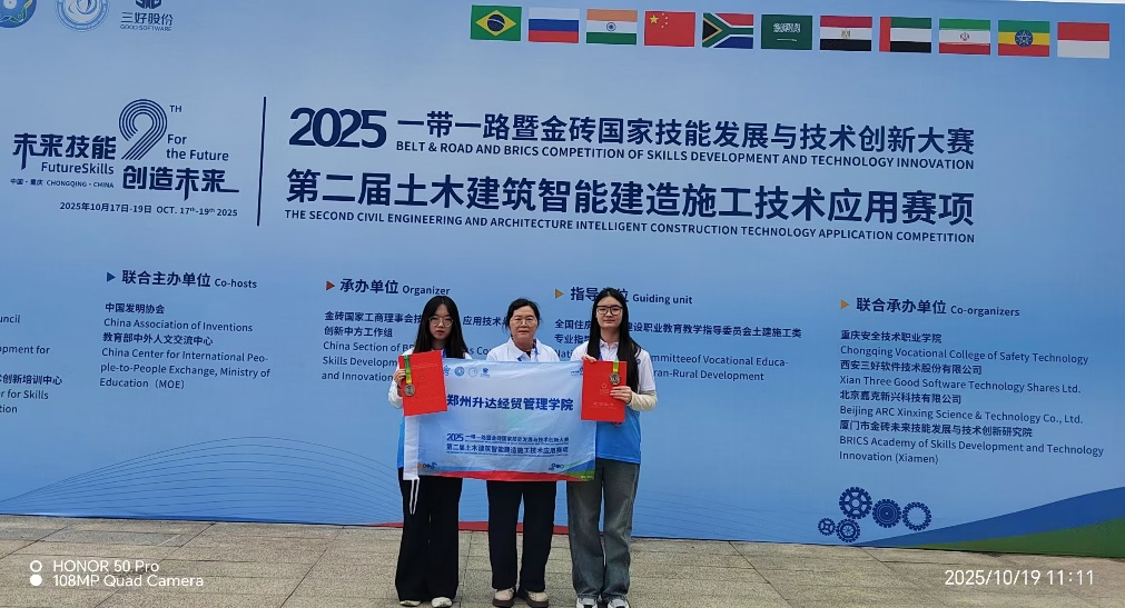 秋深三峡阔,万才聚一州。2025年10月17日至19日,2025“一带一路”暨金砖国家技能发展与技术创新大赛之第二届土木建筑智能建造施工技术应用赛项全国总决赛,在重庆安全技术职业学院隆重举行。来自全国的参赛队伍携匠心赴约、以智能竞技,在这场呼应全球基建“智能+绿色”转型的赛事中,奏响“技能互通、发展互促”的时代强音,为“一带一路”与及智能建造强国建设注入鲜活动能,建筑工程学院经过前期的初赛、区域赛,最终有一支队伍即2022级工程管理专业学生李金月、崔洋洋入围决赛,在詹春老师的指导下,经过认真训练积极准备,比赛中她们沉着冷静,与全国其他高校的学生同同台竞技,最终取得二等奖(银奖)的优异成绩,这也是我校在本赛项中首次获奖。