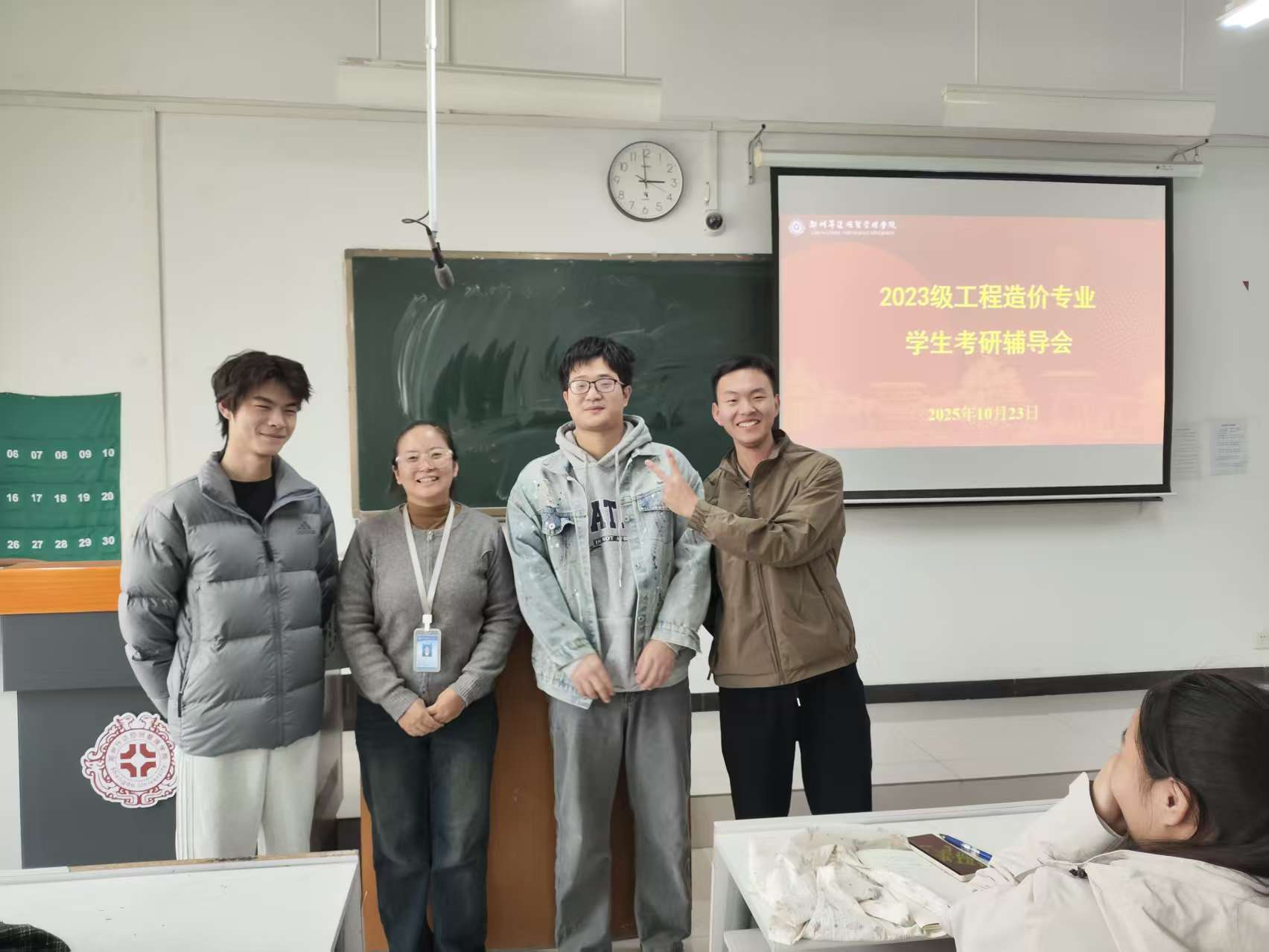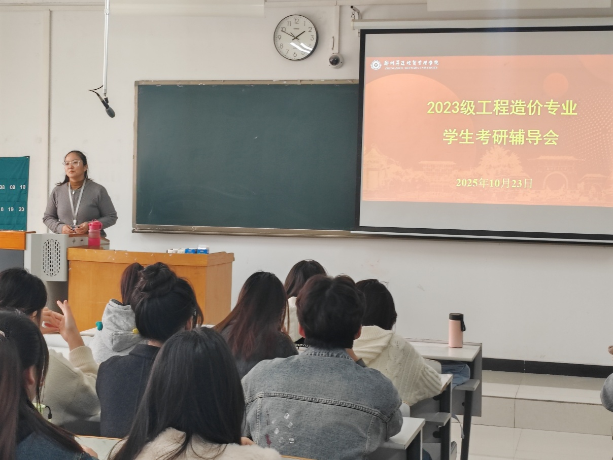 为帮助建工学子深入了解考研流程、明确备考方向、掌握学习方法,建筑工程学院于10月23日下午在万林大楼411教室组织了2023级工程造价专业学生考研辅导会。2023级工程造价专业有意向考研的六十余位同学参加了本次活动,工程造价教研室高曼老师、辅导员邓超峰与三位备战2026届考研的学生共同参与本次交流。