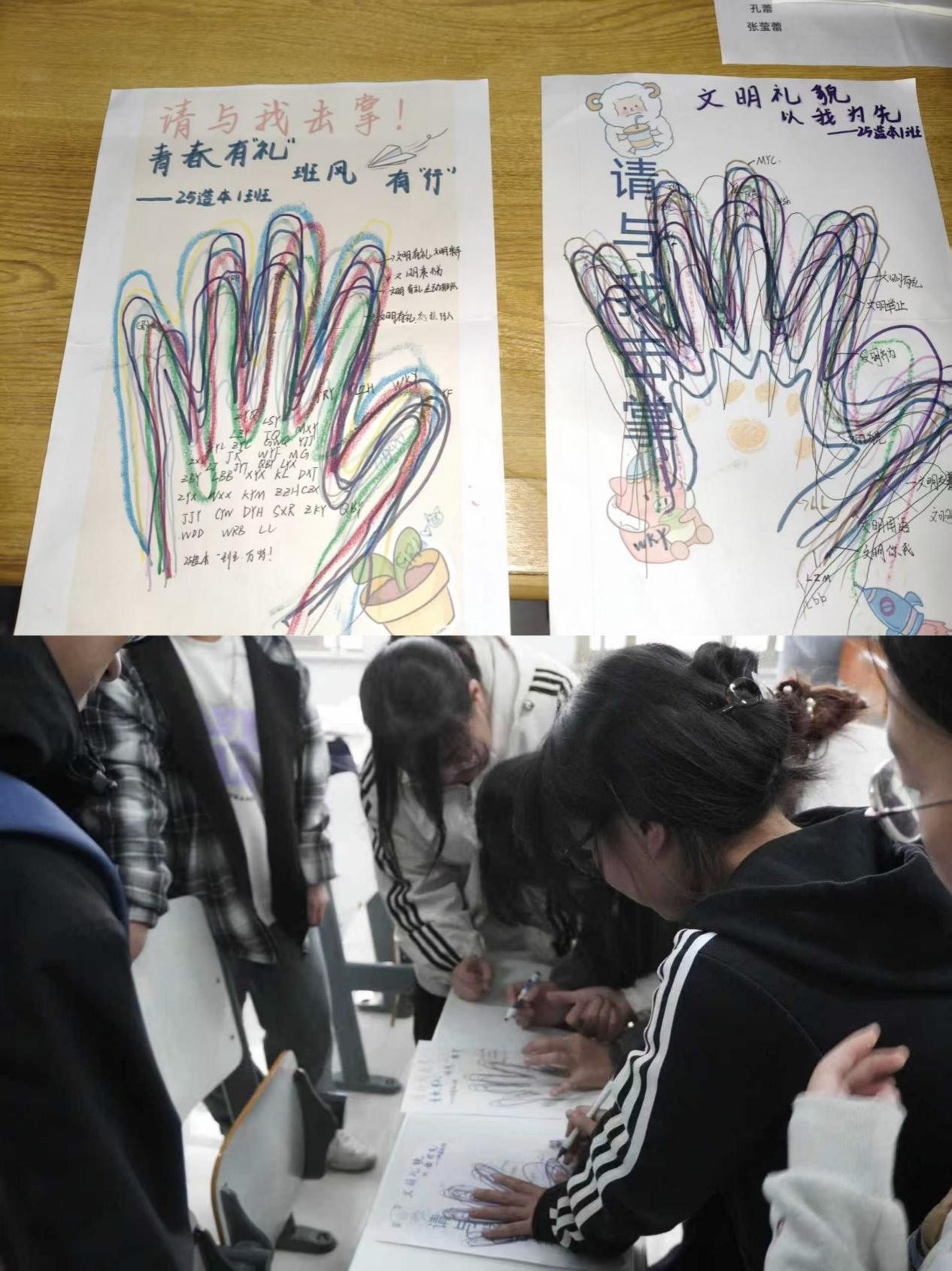 其中“请与我击掌”班级公约签署活动别开生面,深受学生欢迎。活动现场气氛热烈。同学们在印有班级公约的海报前驻足,郑重地将手掌染上色彩,在公约旁留下属于自己的彩色手印。每一个手印都是一份无声的承诺,代表着对遵守课堂纪律、维护宿舍环境、践行礼貌言行等公约条款的真心认可。击掌为约,印为信,简单的仪式让文明规范不再是冰冷的条文,而成为了同学们共同的青春誓言。