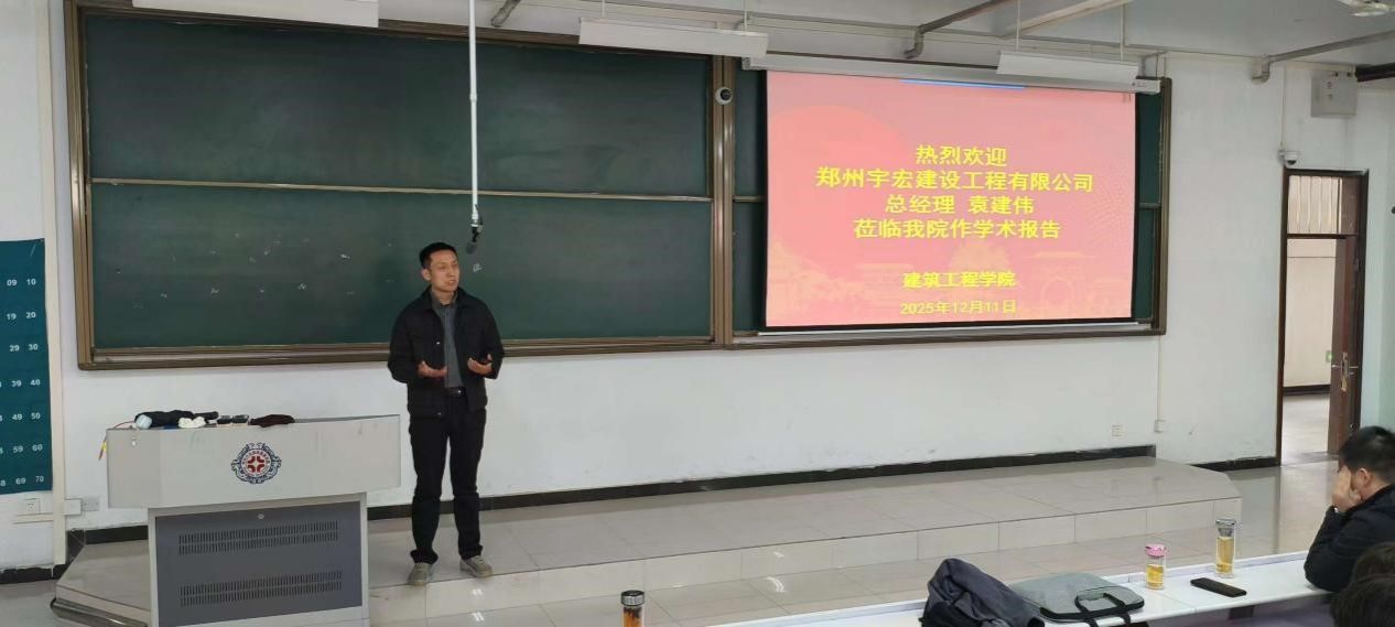 12月11日下午,万林大楼608教室内气氛热烈。受建筑工程学院邀请,郑州宇宏建设工程有限公司总经理袁建伟为学院师生带来了一场精彩的学术报告。本次报告会由院党委书记李松涛主持,土木工程专业教师及大二、大三年级同学参加了本次活动。