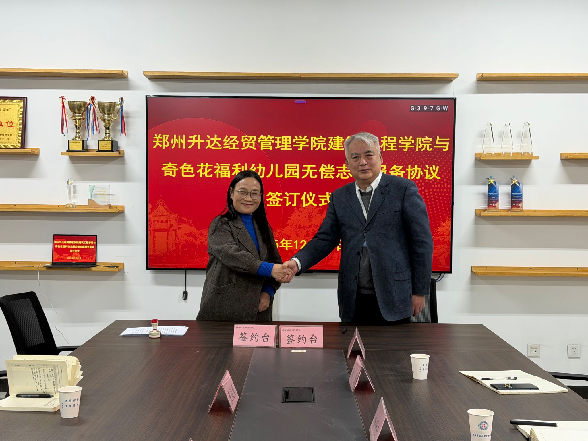 12月29日下午,建筑工程学院与郑州市管城回族区奇色花福利幼儿园在万林大楼3楼会议室举行无偿志愿服务协议签订仪式。奇色花福利幼儿园园长蔡蕾、行政中心主任袁俊青、宣传部负责人邱雨寒一行3人,建筑工程学院院长杨开云、院党委书记李松涛、副院长高燕、校侨联秘书长王博、教学秘书刘杰及部分骨干教师出席本次仪式,共同见证这一暖心时刻。