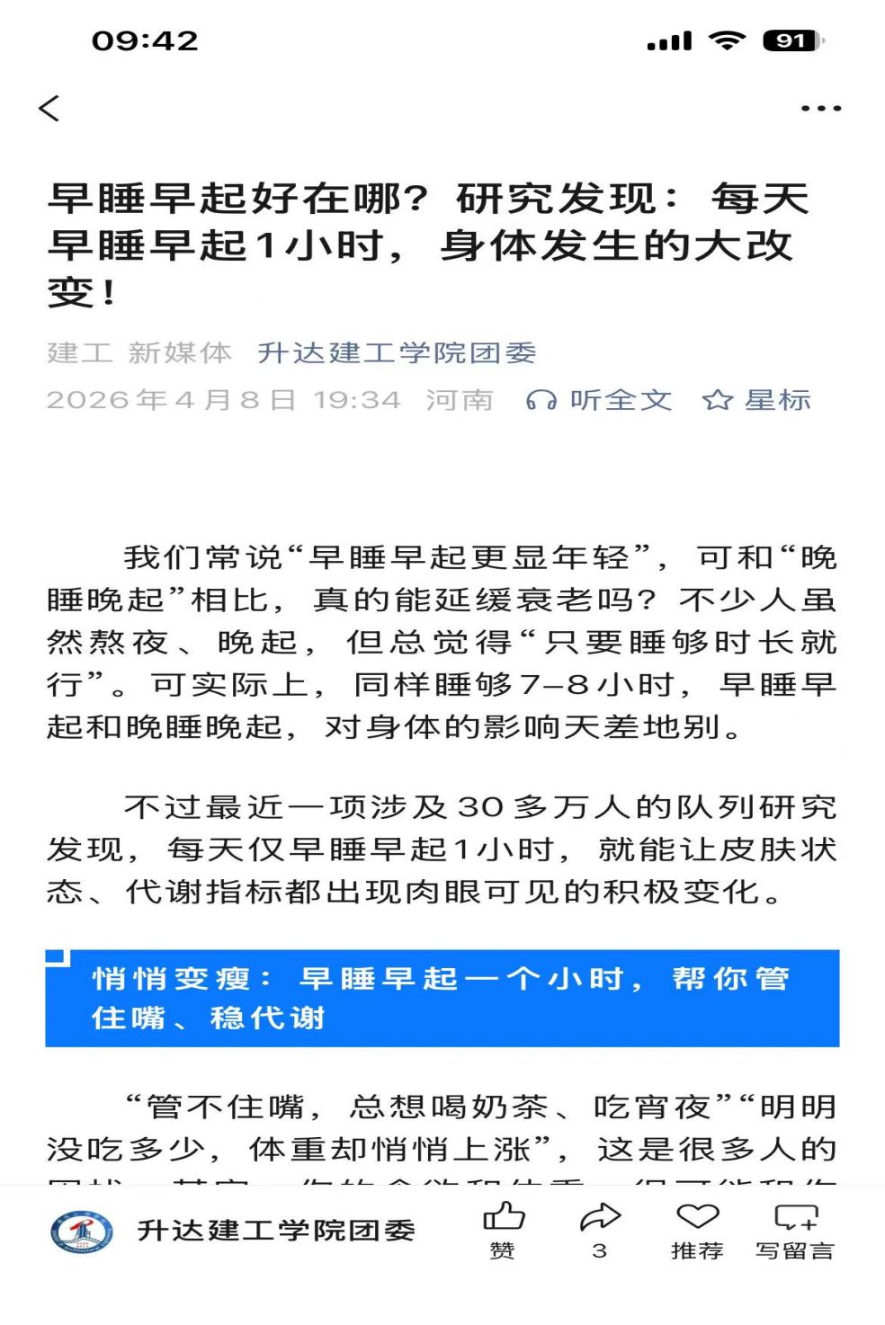学院制作早睡早起宣传展板和公众号推文,引导学生养成早睡早起的好习惯。