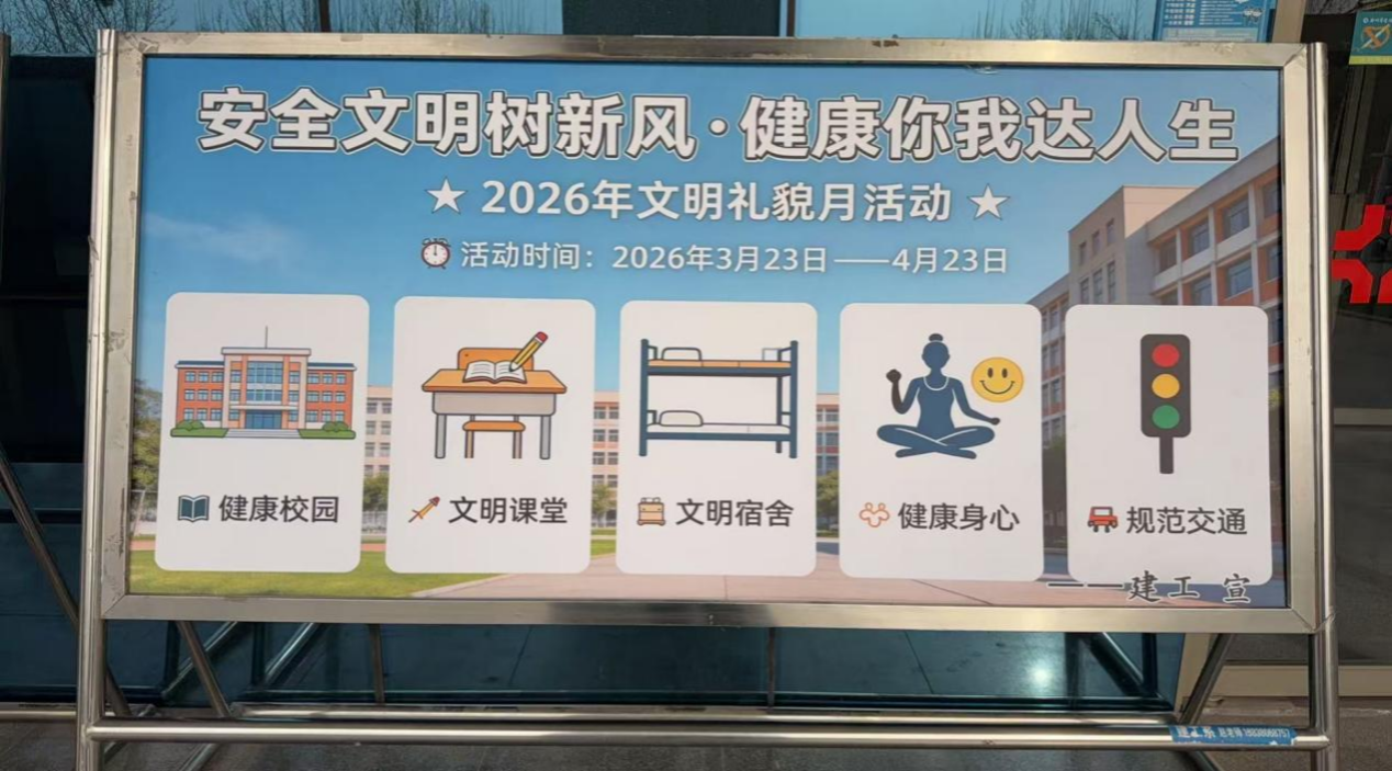 学院精心设计制作文明礼貌主题宣传展板,摆放于教学楼前,让师生在潜移默化中接受文明熏陶,主动争做文明礼仪的践行者与传播者,让文明理念深入人心。