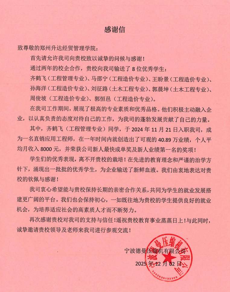 12月2日,我院收到宁波德曼压缩机有限公司感谢信,对我院推荐毕业生实习就业助力公司发展表示感谢。